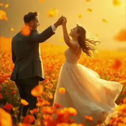 Casal dançando em um campo de flores laranjas ao pôr do sol. O homem veste um terno cinza e a mulher um vestido branco.