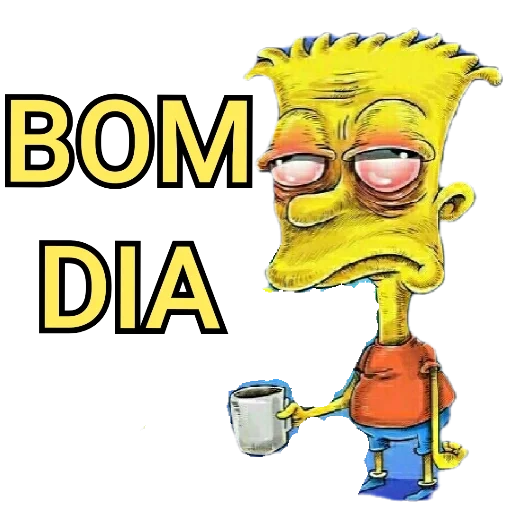 Barto de Simpson com expressão de sono, segurando um copo, ao lado das palavras 'BOM DIA' em letras grandes.