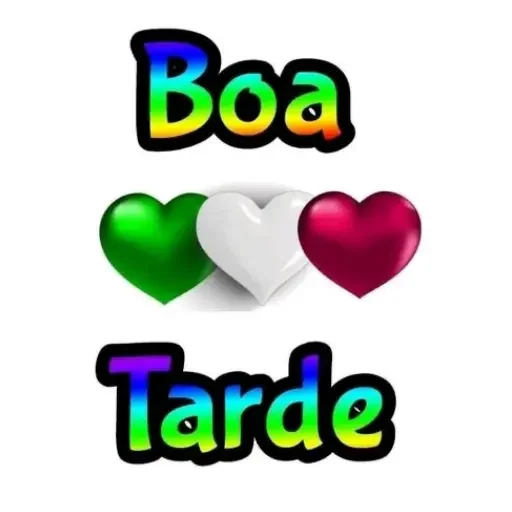 Três corações coloridos (verde, branco e vermelho) com as palavras 'Boa Tarde' em arco-íris.
