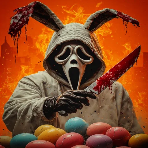 Um personagem de máscara de Ghostface vestindo uma fantasia de coelho com orelhas ensangüentadas, segurando uma faca ensangüentada e com ovos coloridos na frente.