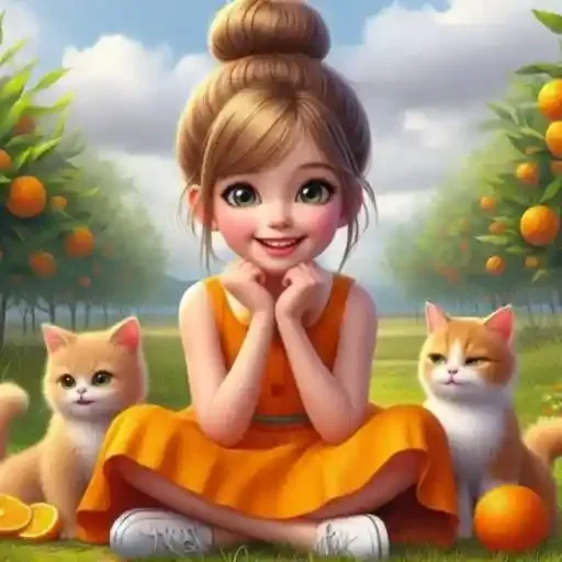 Menina loira com vestido laranja sentada no chão com dois gatos laranjas ao lado, em um campo com árvores de laranja ao fundo.
