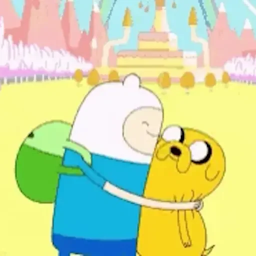Um desenho de Finn e Jake, personagens de Adventure Time, se abraçando. Finn tem uma camisa azul e cabelo branco, enquanto Jake é amarelo e tem olhos grandes.