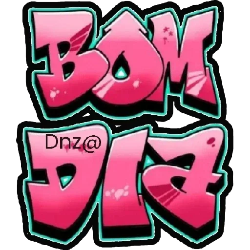Um sticker colorido com o texto 'BOM DIA' em letras grandes e rosadas com contorno verde, com '@Dnz' em menor.