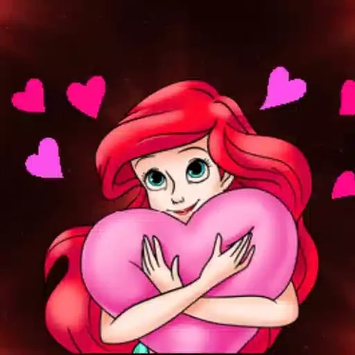 Ariel, a princesa de Cinderela, com longos cabelos vermelhos, abraceja um coração rosa grande, cercada por pequenos corações rosa e roxos.