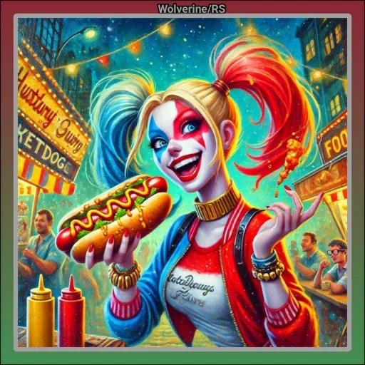 Harley Quinn segurando um cachorro-quente em um cenário colorido de parque de diversões noturno, com maquiagem característica e penteado com mechas azuis e vermelhas.