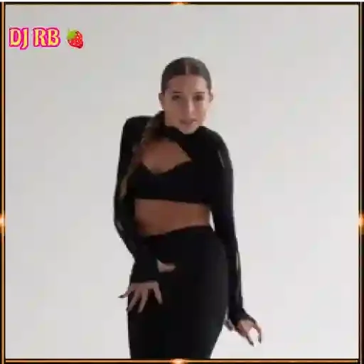 Uma mulher jovem com cabelo castanho em uma trança, vestida com um conjunto preto, com as mãos posicionadas ao lado do corpo. No canto superior esquerdo, há um logotipo que diz 'DJ RB' com uma pequena maçã vermelha.