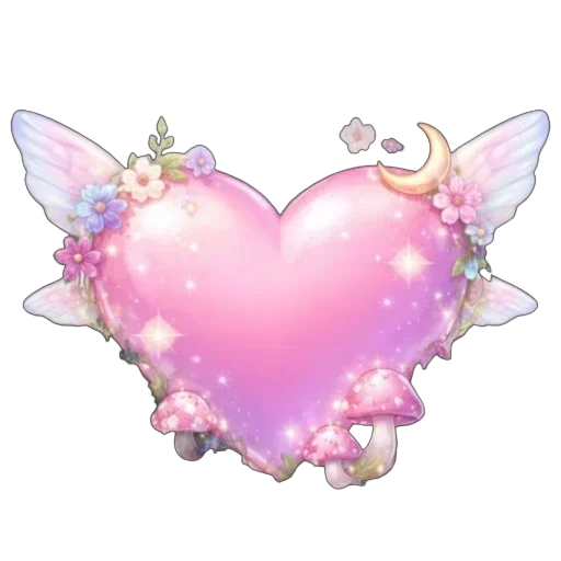 Coração rosa com asas e flores, decorado com lua crescente e estrelas. O coração tem uma aparência brilhante e é adornado com flores e folhas.