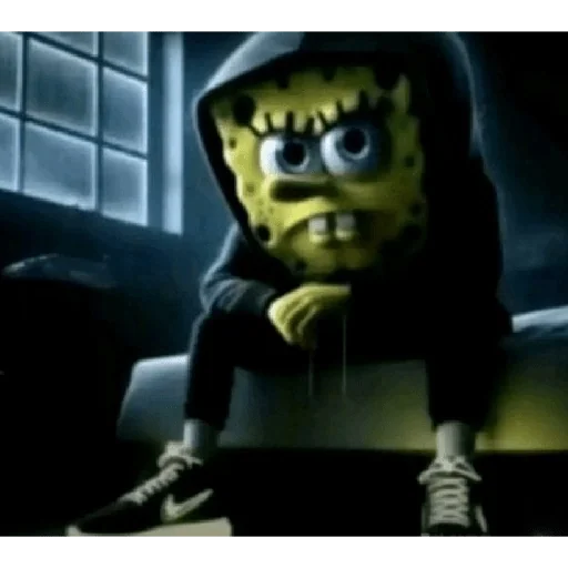 EspongeBob com expressão triste e assustada, vestindo um capuz e sentado em um sofá em frente a uma janela.