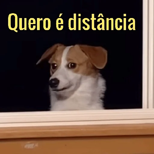 Um cachorro com expressão curiosa e um pouco triste olha por uma janela com uma faixa de madeira, com o texto 'Quero é distância' em amarelo acima dele.