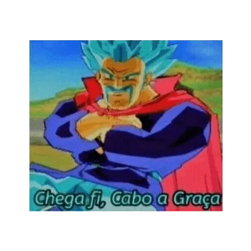 Personagem de anime com cabelo amarelo espetado e roupa roxa fazendo um gesto com a mão. O texto "FALA COM A MINHA MÃO"…