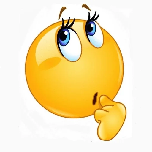 Um emoji amarelo com expressão pensativa, mão no queixo e olhar para cima, com cílios longos e azuis.