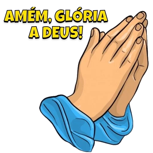 Mãos juntas em oração com as palavras 'AMÉM, GLÓRIA A DEUS!' em amarelo acima. A mão direita está por cima da esquerda, com as palmas voltadas uma para a outra. A manga de uma camisa azul é visível.
