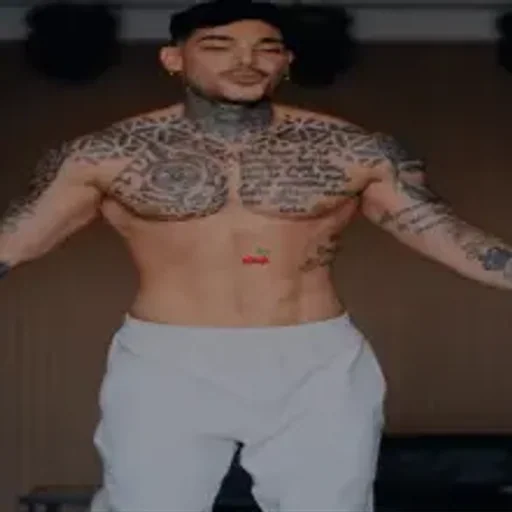Homem sem camisa, com muitos tatuagens no corpo e rosto, usando calça branca. Ele parece estar dançando ou fazendo um gesto.