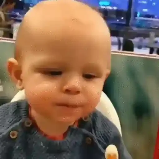 Bebê com expressão facial séria, vestindo uma camisa azul com detalhes laranja. Fundo desfocado.