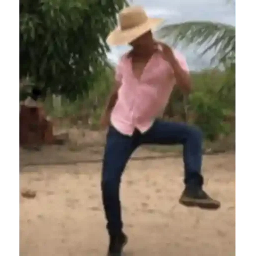 Homem dançando em um local ao ar livre, usando chapéu de palha, camisa rosa e calça jeans.