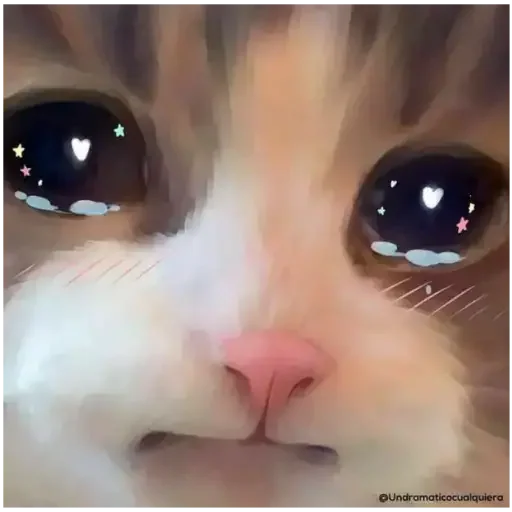 Rosto de um gato com olhos grandes e brilhantes, focados na câmera, com reflexos de coração nos olhos.