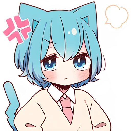 Garota de anime com cabelo azul e orelhas de gato, expressão tímida, usando suéter bege e gravata rosa. Há uma flor rosa no cabelo e uma bolha de fala vazia.
