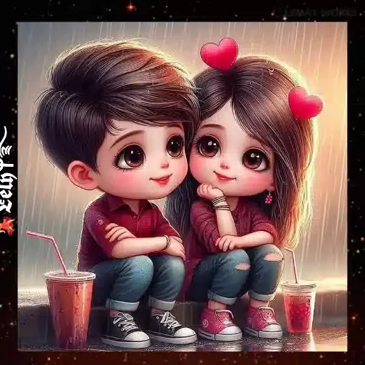 Um casal de jovens sentados em um degrau, abraçados e felizes. O menino tem cabelo castanho e camisa vermelha, enquanto a menina tem cabelo castanho com dois corações vermelhos e uma camisa rosa. Eles estão com copos de bebida nas mãos.