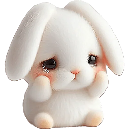 Coelho branco fofinho com expressão triste ou preocupada, orelhas grandes e olhos pretos grandes.