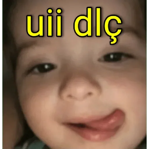 Rosto de bebê com a boca semi-aberta e texto 'uii dlç' em amarelo
