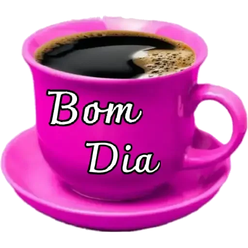Uma xícara rosa com café e um saquinho de chá, com as palavras 'Bom Dia' escritas em branco.