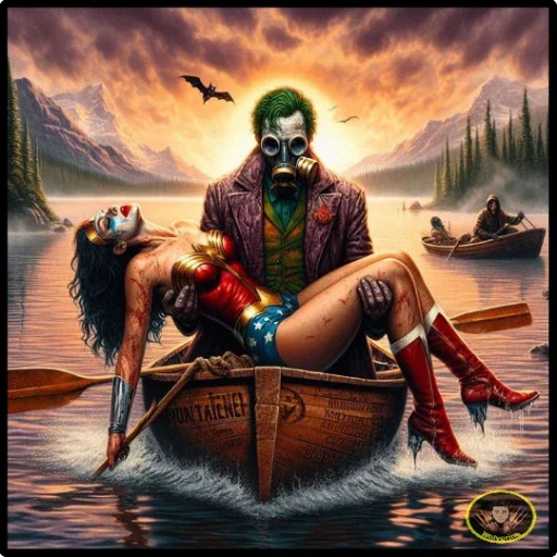 O Coringa e uma mulher, possivelmente Wonder Woman, em um barco a remo em um lago com montanhas ao fundo. O Coringa tem uma expressão sinistra e veste uma jaqueta roxa.