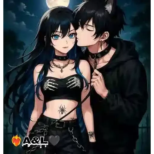 Um casal de anime, um homem e uma mulher, se beijando sob a luz da lua. A mulher tem cabelo preto longo e olhos azuis, vestindo um cropped preto e calça. O homem tem cabelo preto curto e veste um casaco preto.