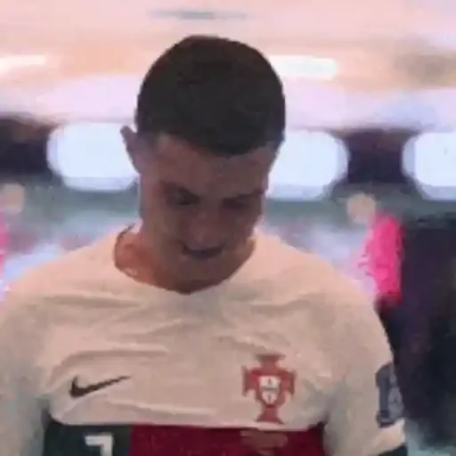 Jogador de futebol com camisa da seleção de Portugal, olhando para baixo com expressão de tristeza ou derrota, em um ambiente desfocado.
