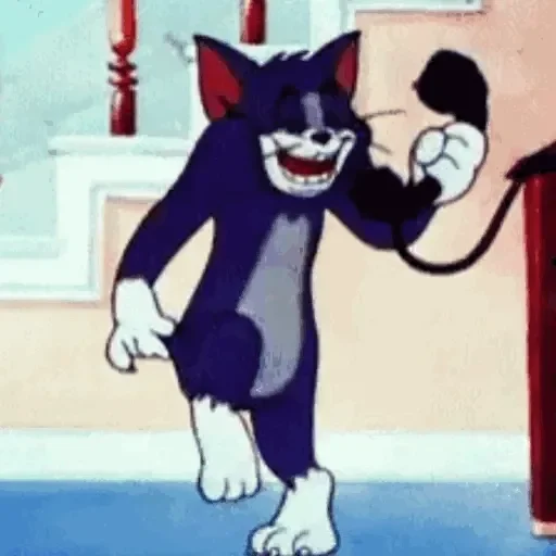 Tom, o gato do desenho animado, falando ao telefone com um sorriso malicioso no rosto e orelhas para cima.