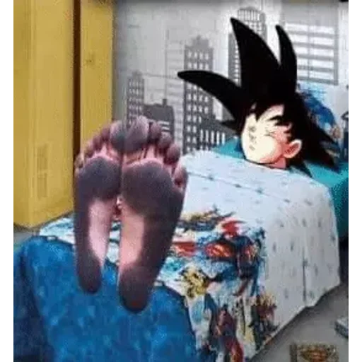 Personagem de anime com cabelo preto espetado deitado na cama, com os pés levantados na frente. A cama tem cobertor azul e branco com personagens coloridos. Fundo cinza com prédios.