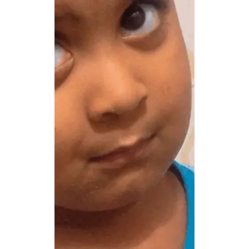 Rosto de uma criança com expressão curiosa, usando uma camisa azul. Olhar para o lado com uma leve inclinação da cabeça.