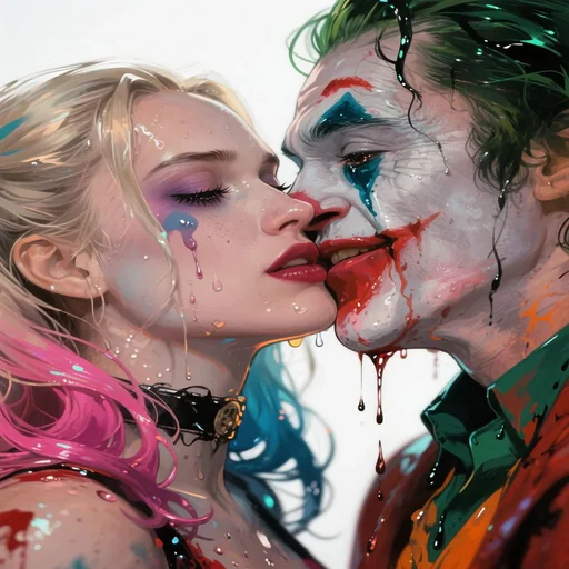 Um casal, aparentemente Harley Quinn e o Coringa, se beijando. Eles têm maquiagem colorida e suja, com respingos de tinta ou sangue.