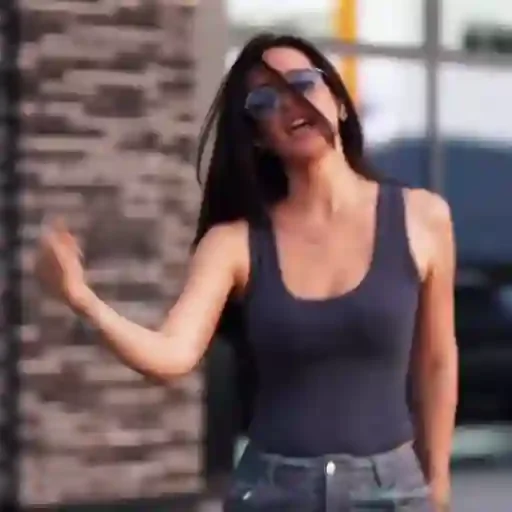 Mulher jovem com óculos de sol e cabelo preto, vestindo um top preto e jeans, fazendo um gesto com a mão esquerda.