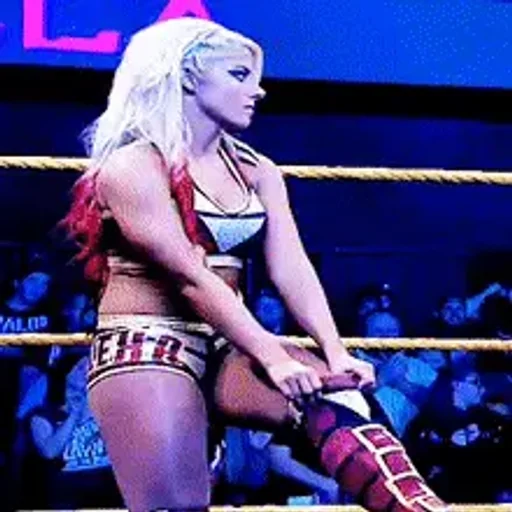 Uma mulher loira com cabelo rosa, vestindo um top vermelho com uma faixa dourada e calcinha preta, em um ringue de luta…
