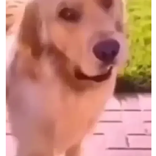 Cachorro dourado com focinho roxo, olhando para frente com a boca semi-aberta.