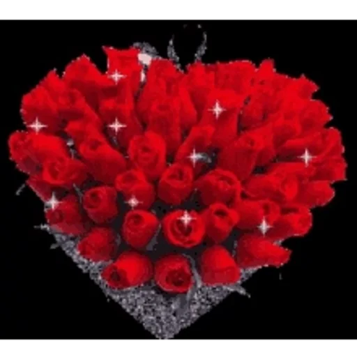 Um buquê de rosas vermelhas em forma de coração, com folhas verdes e brilhos brancos, sobre fundo preto.