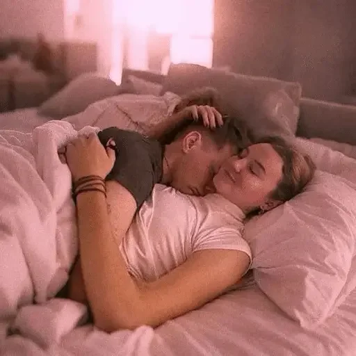 Um casal em uma posição íntima, com o homem deitado sobre a mulher em uma cama.