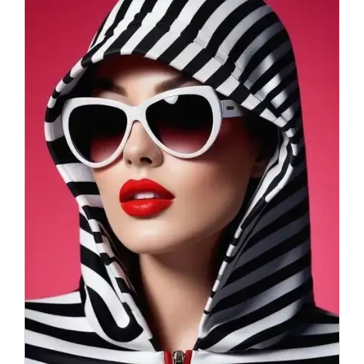 Mulher com óculos de sol brancos e roupa listrada preta e branca, lábios vermelhos, fundo rosa.