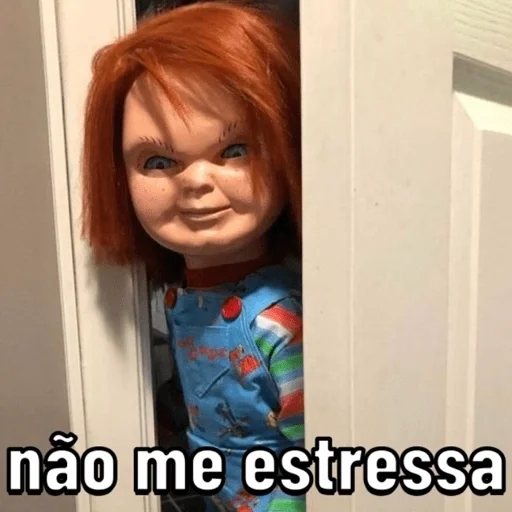 Um boneco de criança com cabelo ruivo e olhos azuis, vestindo uma camisa azul com manchas coloridas, espiando por uma porta entreaberta. A legenda 'não me estressa' aparece embaixo.