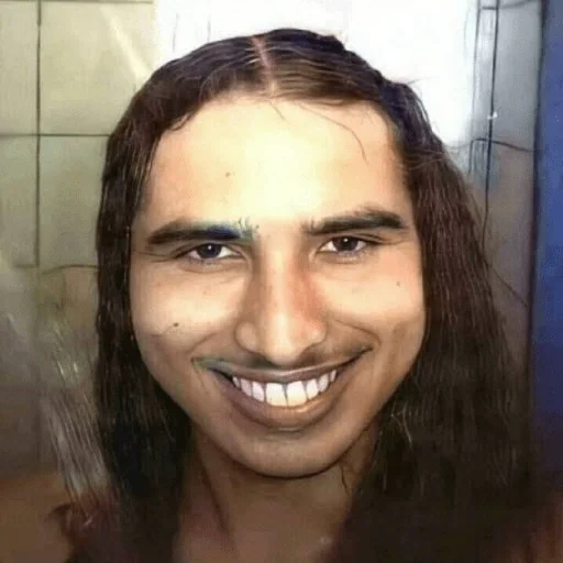 Rosto de uma mulher com sorriso largo e dentes brancos, cabelo castanho e fundo de azulejos.
