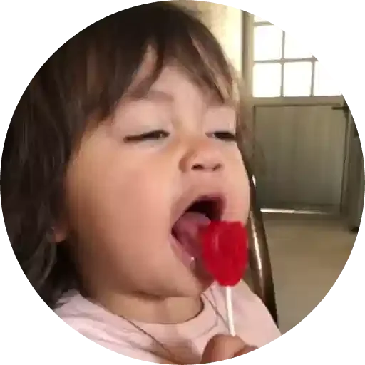 Menina pequena com olhos castanhos e cabelos marrons, com a língua para fora e um sorvete vermelho na boca.