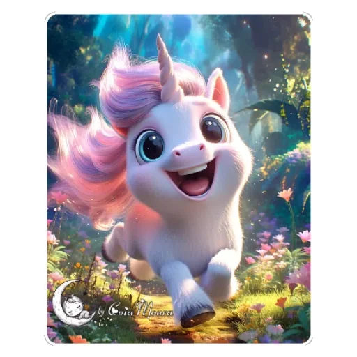 Um unicórnio branco com juba rosa e olhos grandes está correndo em um campo de flores coloridas, com um fundo de floresta e luzes azuis.