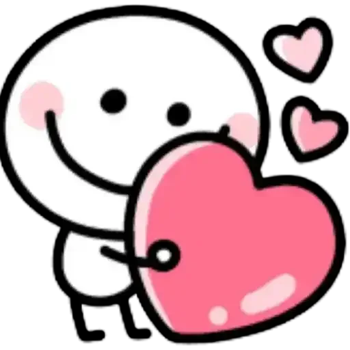Um personagem de desenho animado com um grande sorriso e bochechas rosadas abraçando um coração rosa grande, com dois corações rosas menores flutuando ao lado.