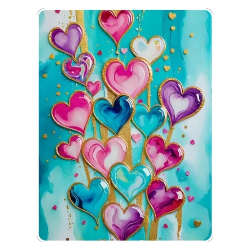 Um conjunto de corações coloridos de diferentes tons de rosa, roxo, azul e branco, com contornos dourados, flutuando em um fundo azul turquesa com pontos de cores.