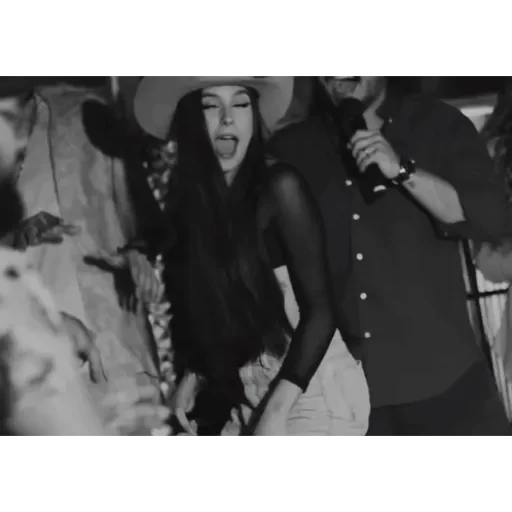 Cena em preto e branco de uma mulher ao lado de um homem com microfone, ambos vestidos formalmente, expressando surpresa ou reação.