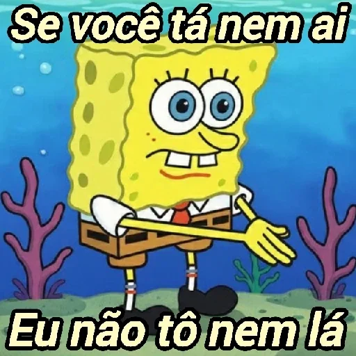 EspongeBob com expressão indiferente e braços estendidos, com coral e água ao fundo. A frase 'Se você tá nem ai Eu não tô nem lá' aparece na imagem.