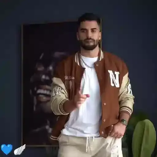 Homem com jaqueta castanha e branca, camiseta branca e calça bege, fazendo um gesto com a mão em frente a um quadro preto e branco.