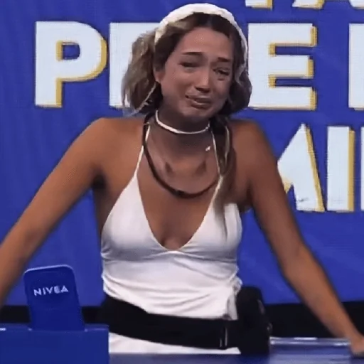 Mulher loira com expressão de surpresa ou descrença, vestindo um top branco e um cinto preto, com um microfone na frente.