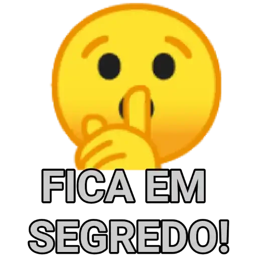 Um emoji amarelo com expressão de surpresa e dedo indicador na frente da boca, com o texto 'FICA EM SEGREDO!' em letras pretas com contorno branco.