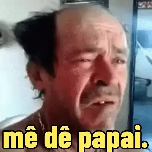 Um homem careca com um topete de cabelo preto, fazendo uma careta, com a frase 'mê dê papai' em amarelo na parte inferior.